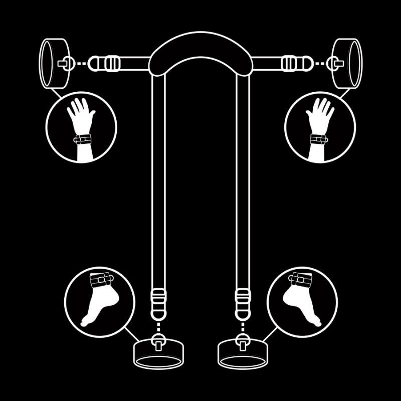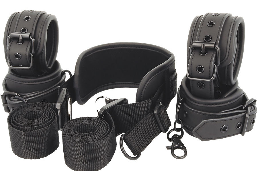 Sada obsahuje 2 nastavitelné pásky od krku k noze, 2 kotníkové manžety, 2 pouta pro ruce, Obojek na krk.